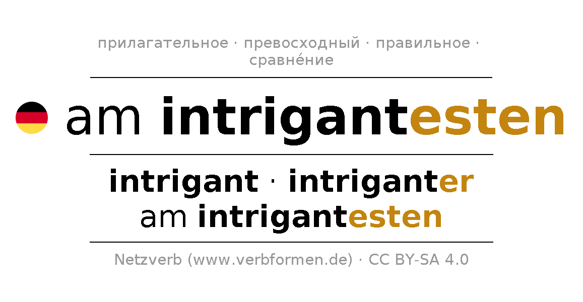 Прилагательное склоняется am intrigantesten (интригующий, коварный) и в степенях сравнения intrigant,intriganter,am intrigantesten . Формы сравнительной и превосходной степеней прилагательного имеют следующие суффиксы er/esten. Прилагательное am intrigantesten может употребляться как в качестве определения перед существительным (с артиклем и без него, в формах сильного, слабого и смешанного склонений), так и в качестве именной части сказуемого в сочетании с глаголом.Можно не только отразить и сравнить am intrigantesten, но и все немецкие прилагательные. Kомментарии ☆