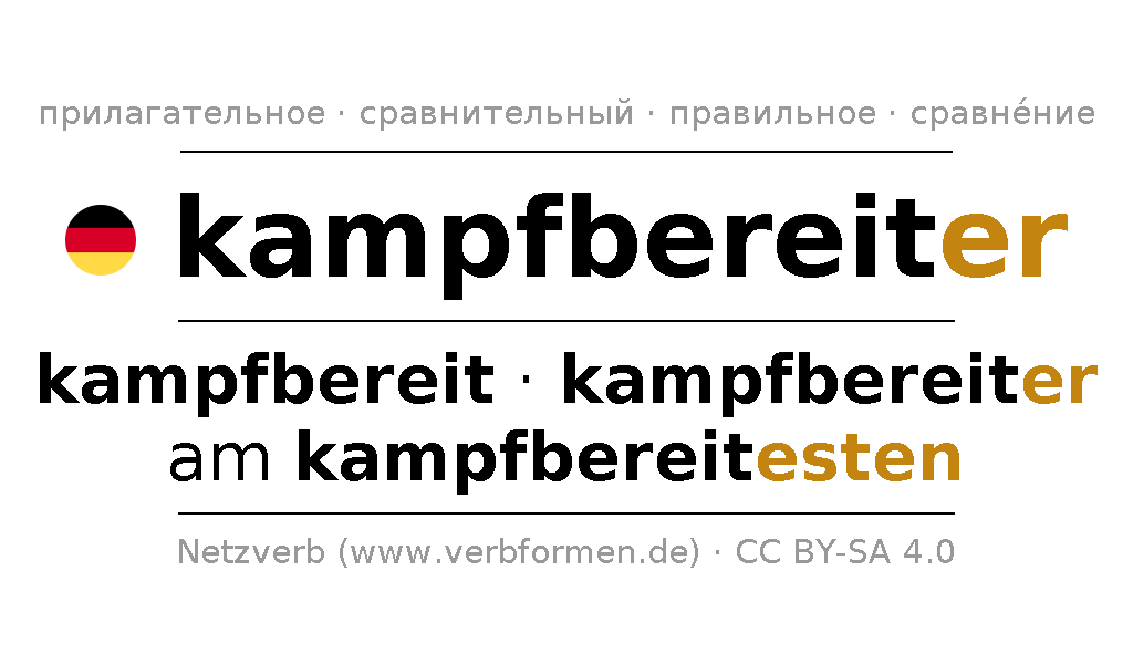 Прилагательное склоняется kampfbereiter (готовый к бою, боевой) и в степенях сравнения kampfbereit,kampfbereiter,am kampfbereitesten . Формы сравнительной и превосходной степеней прилагательного имеют следующие суффиксы er/esten. Прилагательное kampfbereiter может употребляться как в качестве определения перед существительным (с артиклем и без него, в формах сильного, слабого и смешанного склонений), так и в качестве именной части сказуемого в сочетании с глаголом.Можно не только отразить и сравнить kampfbereiter, но и все немецкие прилагательные. Kомментарии ☆