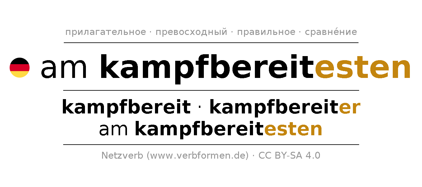 Прилагательное склоняется am kampfbereitesten (готовый к бою, боевой) и в степенях сравнения kampfbereit,kampfbereiter,am kampfbereitesten . Формы сравнительной и превосходной степеней прилагательного имеют следующие суффиксы er/esten. Прилагательное am kampfbereitesten может употребляться как в качестве определения перед существительным (с артиклем и без него, в формах сильного, слабого и смешанного склонений), так и в качестве именной части сказуемого в сочетании с глаголом.Можно не только отразить и сравнить am kampfbereitesten, но и все немецкие прилагательные. Kомментарии ☆