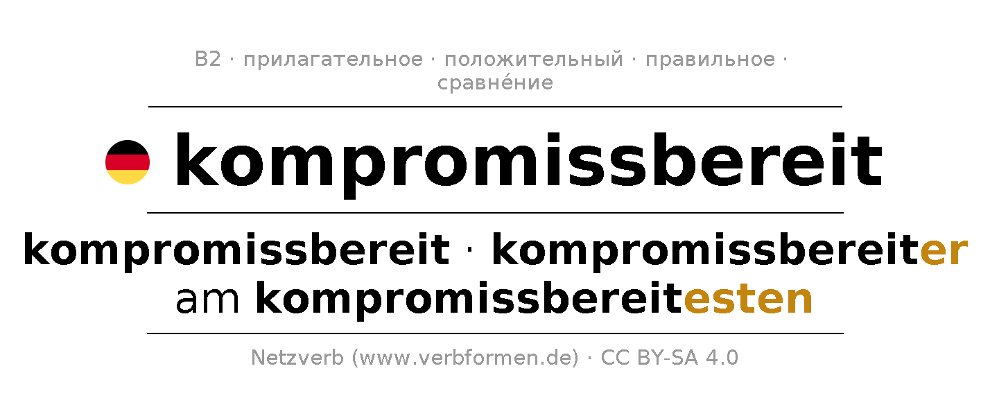 Прилагательное склоняется kompromissbereit (компромиссный, готовый к компромиссу) и в степенях сравнения kompromissbereit,kompromissbereiter,am kompromissbereitesten . Формы сравнительной и превосходной степеней прилагательного имеют следующие суффиксы er/esten. Прилагательное kompromissbereit может употребляться как в качестве определения перед существительным (с артиклем и без него, в формах сильного, слабого и смешанного склонений), так и в качестве именной части сказуемого в сочетании с глаголом.Можно не только отразить и сравнить kompromissbereit, но и все немецкие прилагательные. Kомментарии ☆