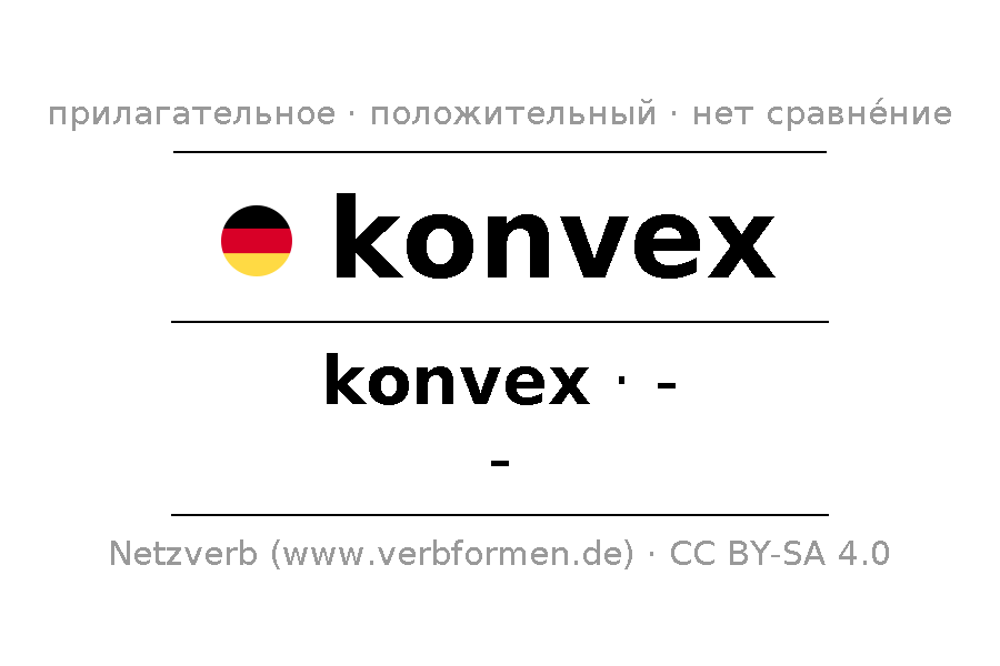 Прилагательное konvex (выпуклый) склоняется в положительной степени сравнения konvex. Прилагательное не имеет сравнительной и превосходной степеней сравнения. Прилагательное konvex может употребляться как в качестве определения перед существительным (с артиклем и без него, в формах сильного, слабого и смешанного склонений), так и в качестве именной части сказуемого в сочетании с глаголом.Можно не только отразить и сравнить konvex, но и все немецкие прилагательные. Kомментарии ☆