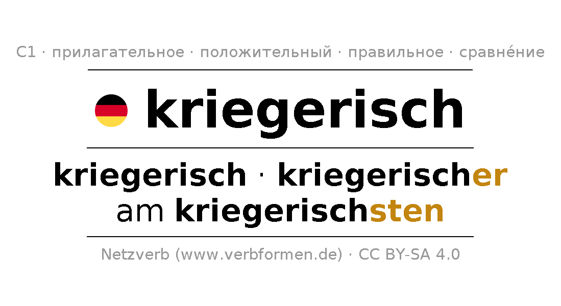 Прилагательное склоняется kriegerisch (агрессивный, воинственный) и в степенях сравнения kriegerisch,kriegerischer,am kriegerischsten . Формы сравнительной и превосходной степеней прилагательного имеют следующие суффиксы er/sten. Прилагательное kriegerisch может употребляться как в качестве определения перед существительным (с артиклем и без него, в формах сильного, слабого и смешанного склонений), так и в качестве именной части сказуемого в сочетании с глаголом.Можно не только отразить и сравнить kriegerisch, но и все немецкие прилагательные. Kомментарии ☆