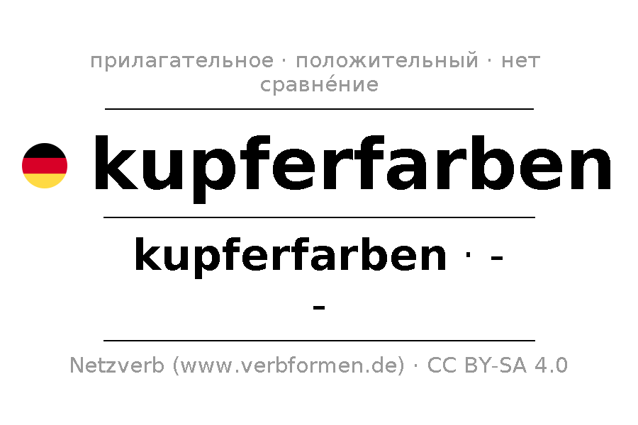 Склонение и степени сравнения kupferfarben онлайн в виде таблиц, содержащих все формы сильного, слабого и смешанного склонений. Для наглядности они сведены в одну общую таблицу, в которой представлены формы единственного (Singular) и множественного (Plural) числа всех четырёх падежей: именительного (номинатив или 1-й падеж - кто? что?), родительного (генитив или 2-й падеж - кого? чего? чей?), дательного (датив или 3-й падеж - кому? чему?) и винительного (аккузатив или 4-й падеж - кого? что?). Более подробную информацию Вы найдёте на ... викисловаря ... и на ... в Дудене.