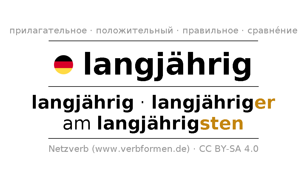Прилагательное склоняется langjährig (долгосрочный, многолетний) и в степенях сравнения langjährig,langjähriger,am langjährigsten . Формы сравнительной и превосходной степеней прилагательного имеют следующие суффиксы er/sten. Прилагательное langjährig может употребляться как в качестве определения перед существительным (с артиклем и без него, в формах сильного, слабого и смешанного склонений), так и в качестве именной части сказуемого в сочетании с глаголом.Можно не только отразить и сравнить langjährig, но и все немецкие прилагательные. Kомментарии ☆