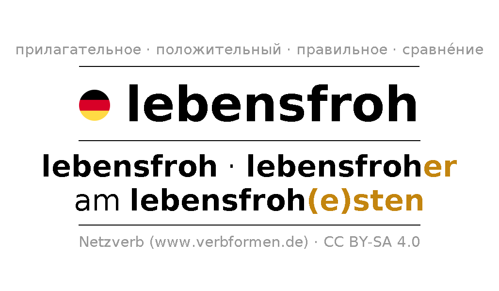 Прилагательное склоняется lebensfroh (жизнерадостный, радостный) и в степенях сравнения lebensfroh,lebensfroher,am lebensfrohesten . Формы сравнительной и превосходной степеней прилагательного имеют следующие суффиксы er/esten. Прилагательное lebensfroh может употребляться как в качестве определения перед существительным (с артиклем и без него, в формах сильного, слабого и смешанного склонений), так и в качестве именной части сказуемого в сочетании с глаголом.Можно не только отразить и сравнить lebensfroh, но и все немецкие прилагательные. Kомментарии ☆