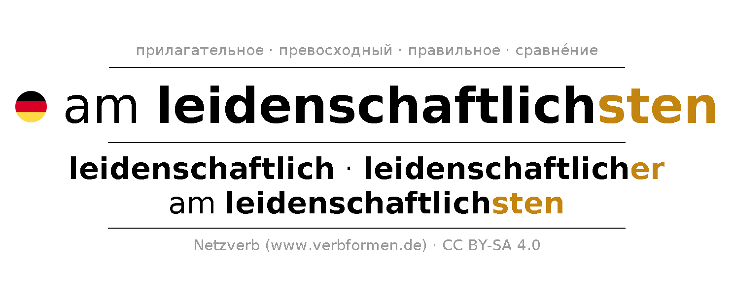 - Множественное число: die leidenschaftlichsten, der leidenschaftlichsten, den leidenschaftlichsten, die leidenschaftlichsten
