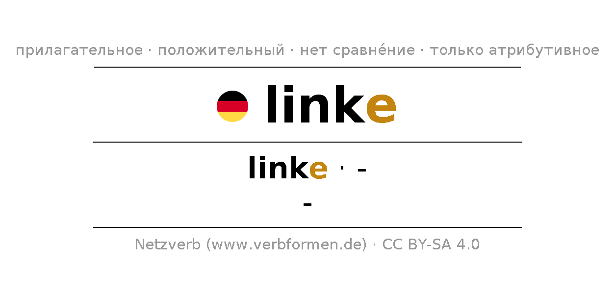 Прилагательное linke (коварный, неискренний) склоняется в положительной степени сравнения linke. Прилагательное не имеет сравнительной и превосходной степеней сравнения. Прилагательное linke может употребляться только в качестве определения перед существительным (с артиклем и без него, в формах сильного, слабого и смешанного склонений). Употребление в качестве именной части сказуемого в сочетании с глаголом исключено.Можно не только отразить и сравнить linke, но и все немецкие прилагательные. Kомментарии ☆