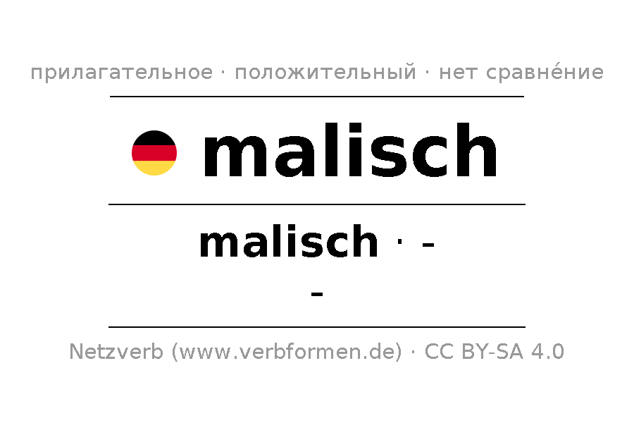 Прилагательное malisch (малийски, малийский) склоняется в положительной степени сравнения malisch. Прилагательное не имеет сравнительной и превосходной степеней сравнения. Прилагательное malisch может употребляться как в качестве определения перед существительным (с артиклем и без него, в формах сильного, слабого и смешанного склонений), так и в качестве именной части сказуемого в сочетании с глаголом.Можно не только отразить и сравнить malisch, но и все немецкие прилагательные. Kомментарии ☆