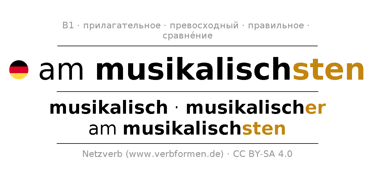 - Множественное число: die musikalischsten, der musikalischsten, den musikalischsten, die musikalischsten