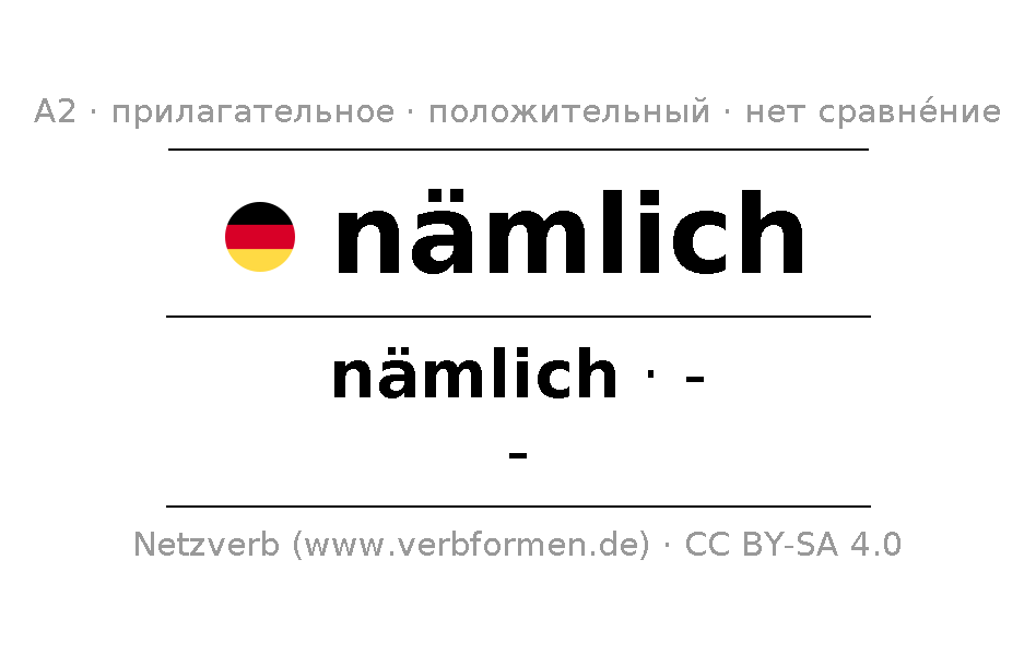 Прилагательное nämlich (а именно, ведь) склоняется в положительной степени сравнения nämlich. Прилагательное не имеет сравнительной и превосходной степеней сравнения. Прилагательное nämlich может употребляться как в качестве определения перед существительным (с артиклем и без него, в формах сильного, слабого и смешанного склонений), так и в качестве именной части сказуемого в сочетании с глаголом.Можно не только отразить и сравнить nämlich, но и все немецкие прилагательные. Kомментарии ☆