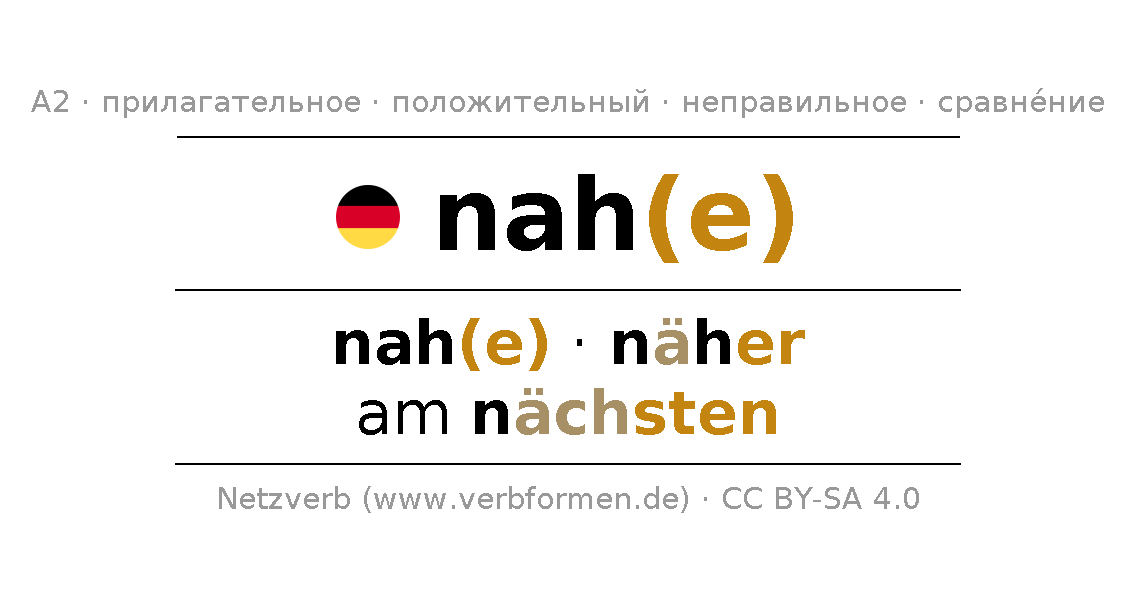 Прилагательное склоняется nah (близкий, рядом) и в степенях сравнения nah,näher,am nächsten . Формы сравнительной и превосходной степеней прилагательного имеют следующие суффиксы ä-er/ä-sten. Прилагательное nah может употребляться как в качестве определения перед существительным (с артиклем и без него, в формах сильного, слабого и смешанного склонений), так и в качестве именной части сказуемого в сочетании с глаголом.Можно не только отразить и сравнить nah, но и все немецкие прилагательные. Kомментарии ☆