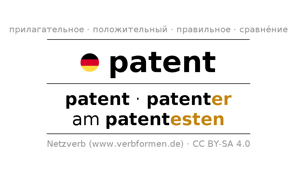 Прилагательное склоняется patent (практичный, симпатичный) и в степенях сравнения patent,patenter,am patentesten . Формы сравнительной и превосходной степеней прилагательного имеют следующие суффиксы er/esten. Прилагательное patent может употребляться как в качестве определения перед существительным (с артиклем и без него, в формах сильного, слабого и смешанного склонений), так и в качестве именной части сказуемого в сочетании с глаголом.Можно не только отразить и сравнить patent, но и все немецкие прилагательные. Kомментарии ☆