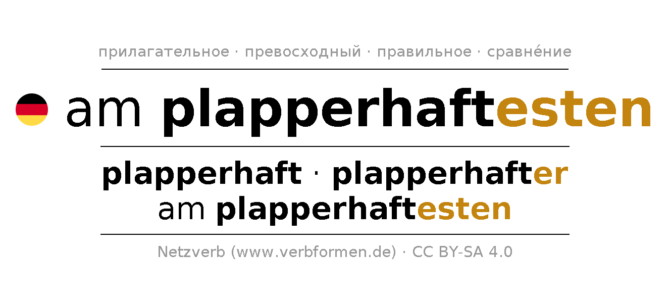 Прилагательное склоняется am plapperhaftesten (болтливый, разговорчивый) и в степенях сравнения plapperhaft,plapperhafter,am plapperhaftesten . Формы сравнительной и превосходной степеней прилагательного имеют следующие суффиксы er/esten. Прилагательное am plapperhaftesten может употребляться как в качестве определения перед существительным (с артиклем и без него, в формах сильного, слабого и смешанного склонений), так и в качестве именной части сказуемого в сочетании с глаголом.Можно не только отразить и сравнить am plapperhaftesten, но и все немецкие прилагательные. Kомментарии ☆