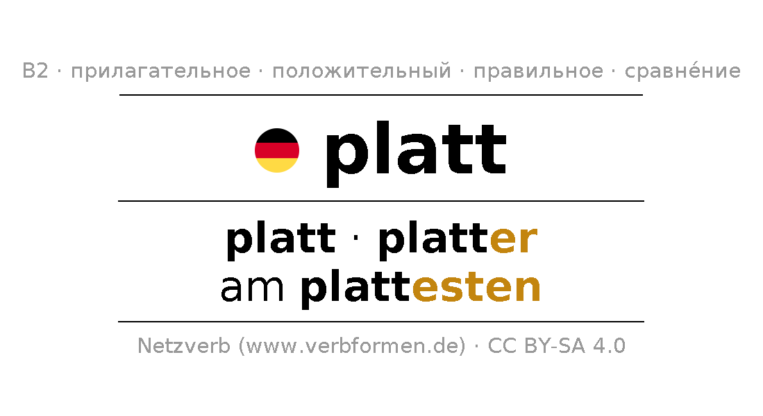 Прилагательное склоняется platt (плоский, без воздуха) и в степенях сравнения platt,platter,am plattesten . Формы сравнительной и превосходной степеней прилагательного имеют следующие суффиксы er/esten. Прилагательное platt может употребляться как в качестве определения перед существительным (с артиклем и без него, в формах сильного, слабого и смешанного склонений), так и в качестве именной части сказуемого в сочетании с глаголом.Можно не только отразить и сравнить platt, но и все немецкие прилагательные. Kомментарии ☆