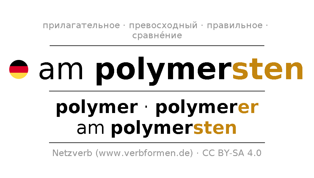 Прилагательное склоняется am polymersten (полимерный) и в степенях сравнения polymer,polymerer,am polymersten . Формы сравнительной и превосходной степеней прилагательного имеют следующие суффиксы er/sten. Прилагательное am polymersten может употребляться как в качестве определения перед существительным (с артиклем и без него, в формах сильного, слабого и смешанного склонений), так и в качестве именной части сказуемого в сочетании с глаголом.Можно не только отразить и сравнить am polymersten, но и все немецкие прилагательные. Kомментарии ☆