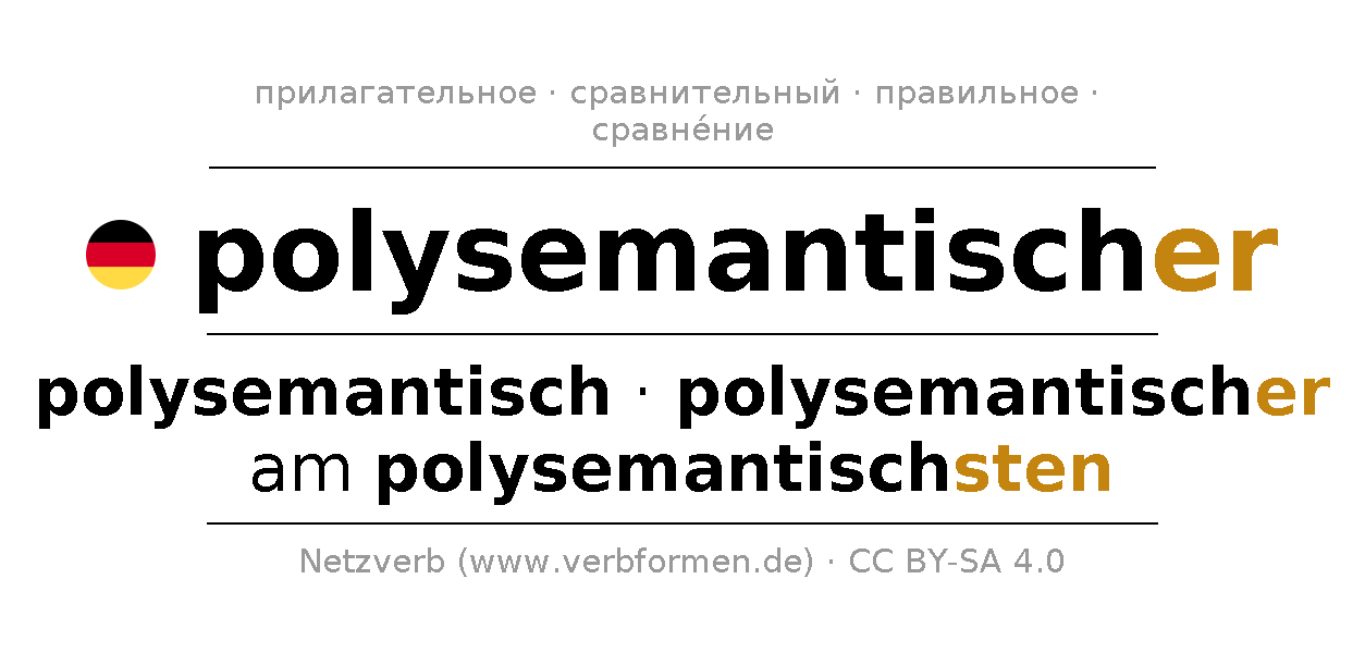 Прилагательное склоняется polysemantischer (многоаспектный, многозначный) и в степенях сравнения polysemantisch,polysemantischer,am polysemantischsten . Формы сравнительной и превосходной степеней прилагательного имеют следующие суффиксы er/sten. Прилагательное polysemantischer может употребляться как в качестве определения перед существительным (с артиклем и без него, в формах сильного, слабого и смешанного склонений), так и в качестве именной части сказуемого в сочетании с глаголом.Можно не только отразить и сравнить polysemantischer, но и все немецкие прилагательные. Kомментарии ☆