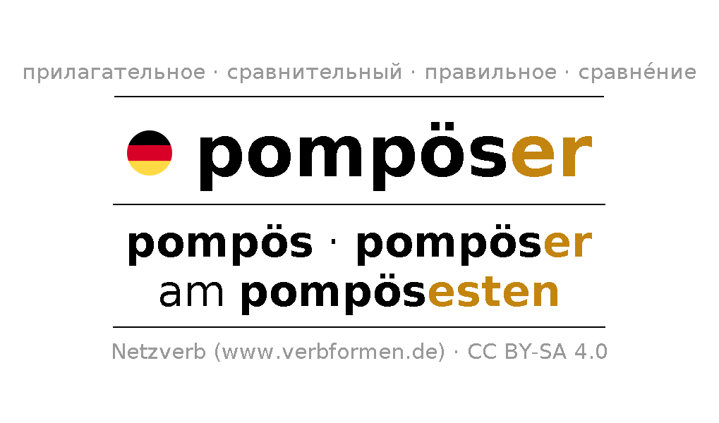 Прилагательное склоняется pompöser (помпезный, роскошный) и в степенях сравнения pompös,pompöser,am pompösesten . Формы сравнительной и превосходной степеней прилагательного имеют следующие суффиксы er/esten. Прилагательное pompöser может употребляться как в качестве определения перед существительным (с артиклем и без него, в формах сильного, слабого и смешанного склонений), так и в качестве именной части сказуемого в сочетании с глаголом.Можно не только отразить и сравнить pompöser, но и все немецкие прилагательные. Kомментарии ☆