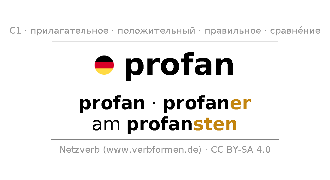 Прилагательное склоняется profan (мирской, обычный) и в степенях сравнения profan,profaner,am profansten . Формы сравнительной и превосходной степеней прилагательного имеют следующие суффиксы er/sten. Прилагательное profan может употребляться как в качестве определения перед существительным (с артиклем и без него, в формах сильного, слабого и смешанного склонений), так и в качестве именной части сказуемого в сочетании с глаголом.Можно не только отразить и сравнить profan, но и все немецкие прилагательные. Kомментарии ☆