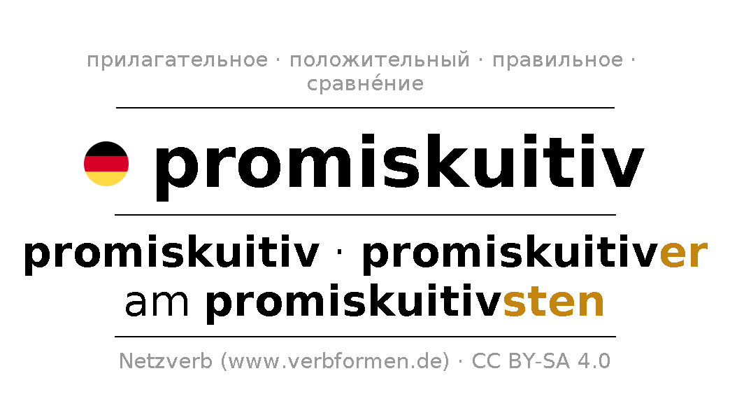 Прилагательное склоняется promiskuitiv (неразборчивый, промискуитетный) и в степенях сравнения promiskuitiv,promiskuitiver,am promiskuitivsten . Формы сравнительной и превосходной степеней прилагательного имеют следующие суффиксы er/sten. Прилагательное promiskuitiv может употребляться как в качестве определения перед существительным (с артиклем и без него, в формах сильного, слабого и смешанного склонений), так и в качестве именной части сказуемого в сочетании с глаголом.Можно не только отразить и сравнить promiskuitiv, но и все немецкие прилагательные. Kомментарии ☆