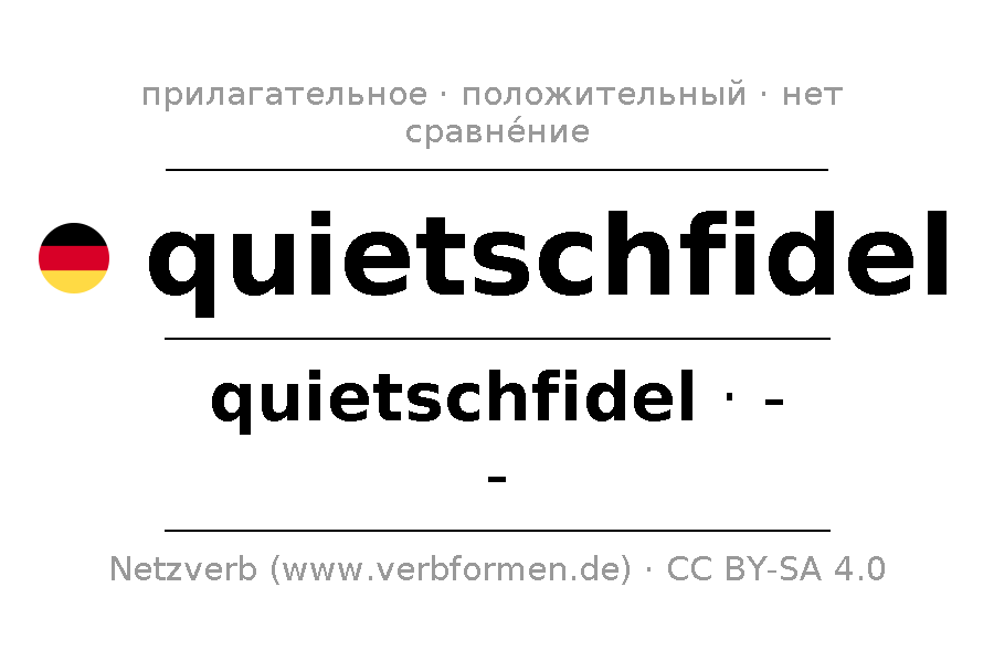 Склонение и степени сравнения quietschfidel онлайн в виде таблиц, содержащих все формы сильного, слабого и смешанного склонений. Для наглядности они сведены в одну общую таблицу, в которой представлены формы единственного (Singular) и множественного (Plural) числа всех четырёх падежей: именительного (номинатив или 1-й падеж - кто? что?), родительного (генитив или 2-й падеж - кого? чего? чей?), дательного (датив или 3-й падеж - кому? чему?) и винительного (аккузатив или 4-й падеж - кого? что?). Более подробную информацию Вы найдёте на ... викисловаря ... и на ... в Дудене.