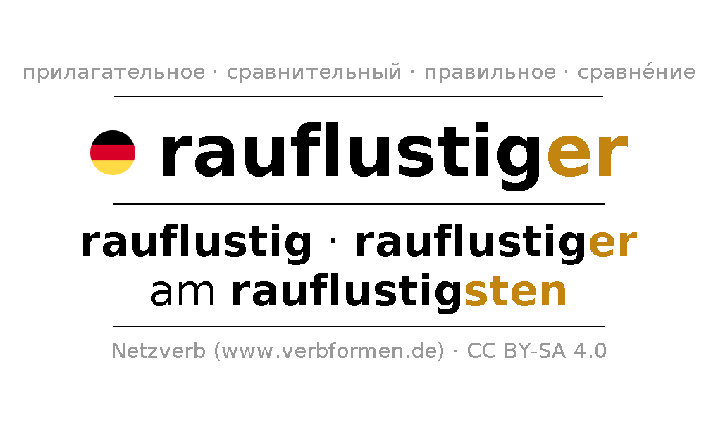 Прилагательное склоняется rauflustiger (драчливый, склонный к дракам) и в степенях сравнения rauflustig,rauflustiger,am rauflustigsten . Формы сравнительной и превосходной степеней прилагательного имеют следующие суффиксы er/sten. Прилагательное rauflustiger может употребляться как в качестве определения перед существительным (с артиклем и без него, в формах сильного, слабого и смешанного склонений), так и в качестве именной части сказуемого в сочетании с глаголом.Можно не только отразить и сравнить rauflustiger, но и все немецкие прилагательные. Kомментарии ☆