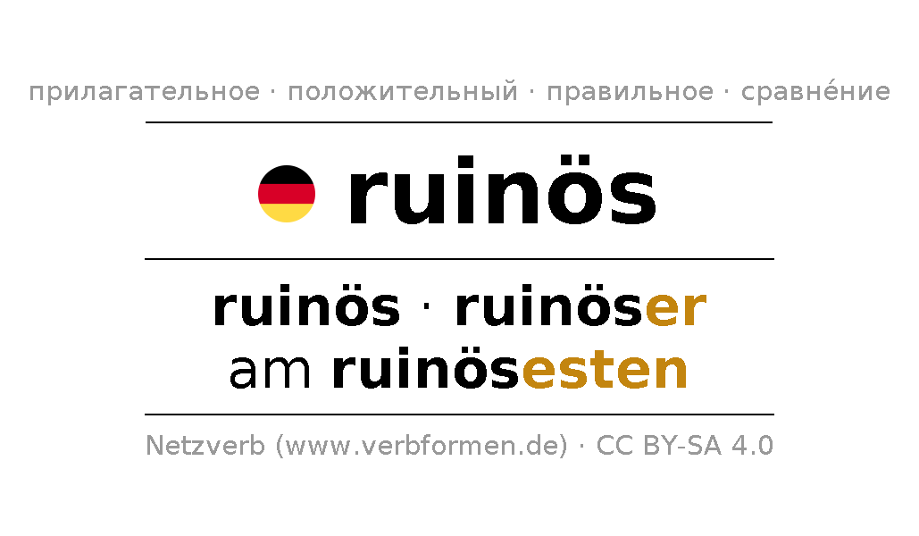 Склонение и степени сравнения ruinös онлайн в виде таблиц, содержащих все формы сильного, слабого и смешанного склонений. Для наглядности они сведены в одну общую таблицу, в которой представлены формы единственного (Singular) и множественного (Plural) числа всех четырёх падежей: именительного (номинатив или 1-й падеж - кто? что?), родительного (генитив или 2-й падеж - кого? чего? чей?), дательного (датив или 3-й падеж - кому? чему?) и винительного (аккузатив или 4-й падеж - кого? что?). Более подробную информацию Вы найдёте на ... викисловаря ... и на ... в Дудене.
