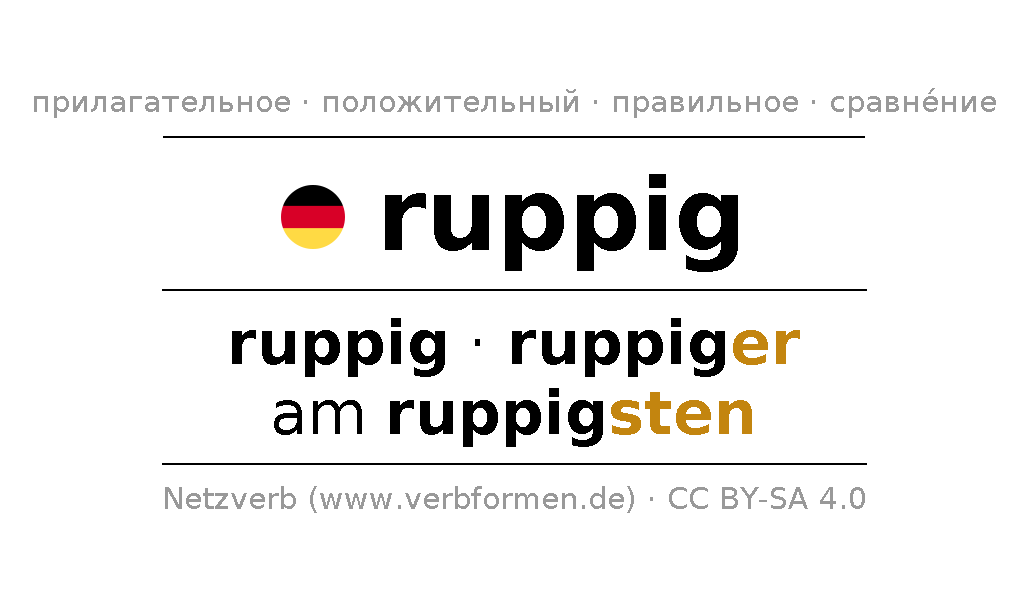 Прилагательное склоняется ruppig (грубый, недружелюбный) и в степенях сравнения ruppig,ruppiger,am ruppigsten . Формы сравнительной и превосходной степеней прилагательного имеют следующие суффиксы er/sten. Прилагательное ruppig может употребляться как в качестве определения перед существительным (с артиклем и без него, в формах сильного, слабого и смешанного склонений), так и в качестве именной части сказуемого в сочетании с глаголом.Можно не только отразить и сравнить ruppig, но и все немецкие прилагательные. Kомментарии ☆