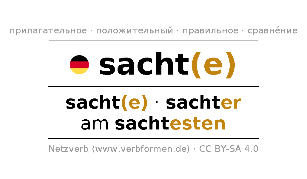 Прилагательное склоняется sacht (внимательный, едва заметный) и в степенях сравнения sacht,sachter,am sachtesten . Формы сравнительной и превосходной степеней прилагательного имеют следующие суффиксы er/esten. Прилагательное sacht может употребляться как в качестве определения перед существительным (с артиклем и без него, в формах сильного, слабого и смешанного склонений), так и в качестве именной части сказуемого в сочетании с глаголом.Можно не только отразить и сравнить sacht, но и все немецкие прилагательные. Kомментарии ☆