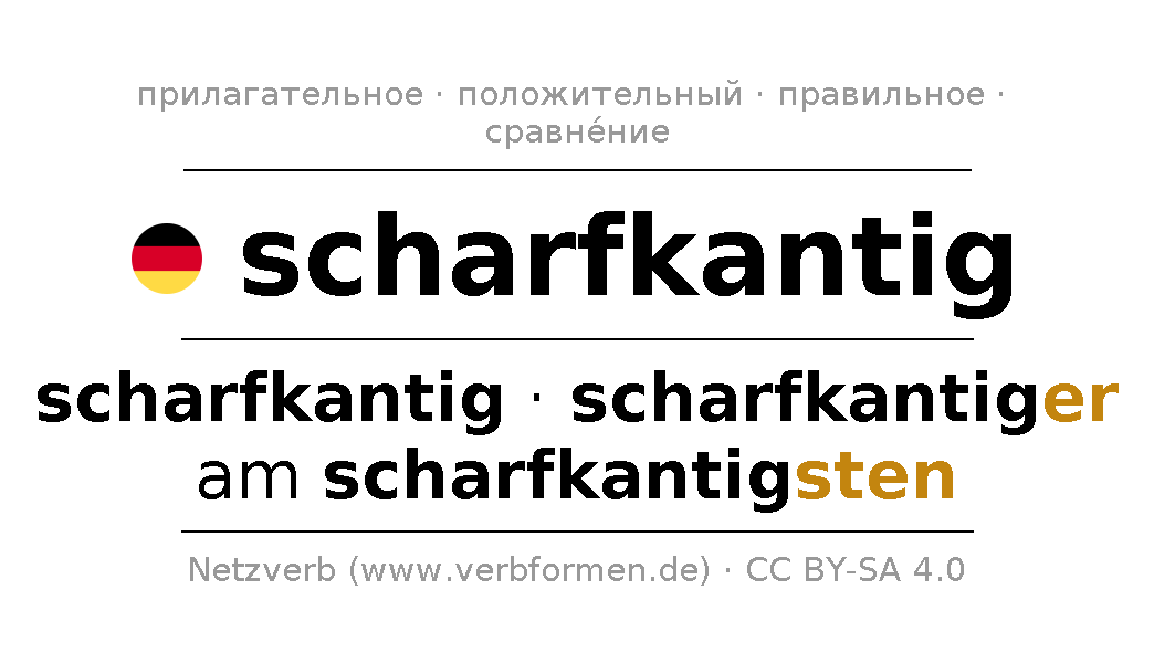 Прилагательное склоняется scharfkantig (остроконечный, с острыми краями) и в степенях сравнения scharfkantig,scharfkantiger,am scharfkantigsten . Формы сравнительной и превосходной степеней прилагательного имеют следующие суффиксы er/sten. Прилагательное scharfkantig может употребляться как в качестве определения перед существительным (с артиклем и без него, в формах сильного, слабого и смешанного склонений), так и в качестве именной части сказуемого в сочетании с глаголом.Можно не только отразить и сравнить scharfkantig, но и все немецкие прилагательные. Kомментарии ☆