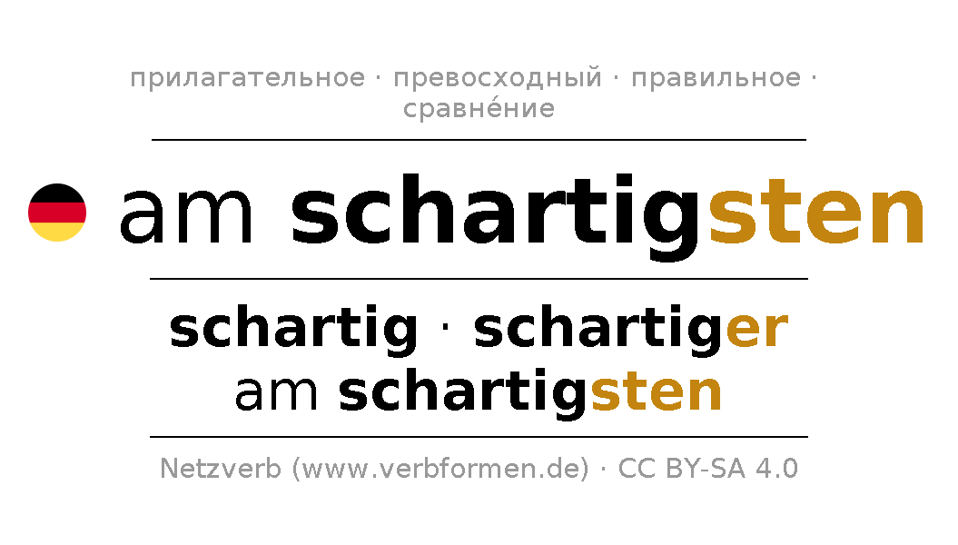 Прилагательное склоняется am schartigsten (порезанный, царапанный) и в степенях сравнения schartig,schartiger,am schartigsten . Формы сравнительной и превосходной степеней прилагательного имеют следующие суффиксы er/sten. Прилагательное am schartigsten может употребляться как в качестве определения перед существительным (с артиклем и без него, в формах сильного, слабого и смешанного склонений), так и в качестве именной части сказуемого в сочетании с глаголом.Можно не только отразить и сравнить am schartigsten, но и все немецкие прилагательные. Kомментарии ☆