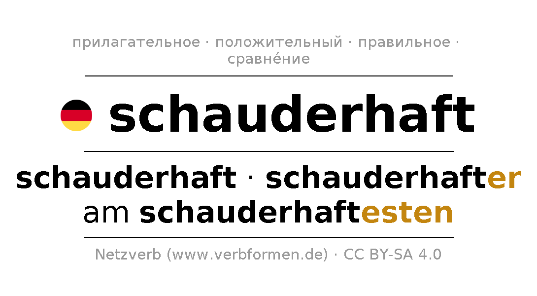 Прилагательное склоняется schauderhaft (ужасный, отвратительный) и в степенях сравнения schauderhaft,schauderhafter,am schauderhaftesten . Формы сравнительной и превосходной степеней прилагательного имеют следующие суффиксы er/esten. Прилагательное schauderhaft может употребляться как в качестве определения перед существительным (с артиклем и без него, в формах сильного, слабого и смешанного склонений), так и в качестве именной части сказуемого в сочетании с глаголом.Можно не только отразить и сравнить schauderhaft, но и все немецкие прилагательные. Kомментарии ☆