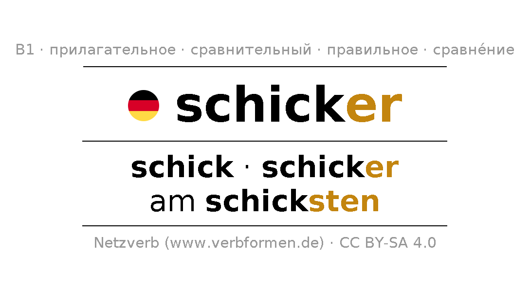 Прилагательное склоняется schicker (элегантный, стильный) и в степенях сравнения schick,schicker,am schicksten . Формы сравнительной и превосходной степеней прилагательного имеют следующие суффиксы er/sten. Прилагательное schicker может употребляться как в качестве определения перед существительным (с артиклем и без него, в формах сильного, слабого и смешанного склонений), так и в качестве именной части сказуемого в сочетании с глаголом.Можно не только отразить и сравнить schicker, но и все немецкие прилагательные. Kомментарии ☆