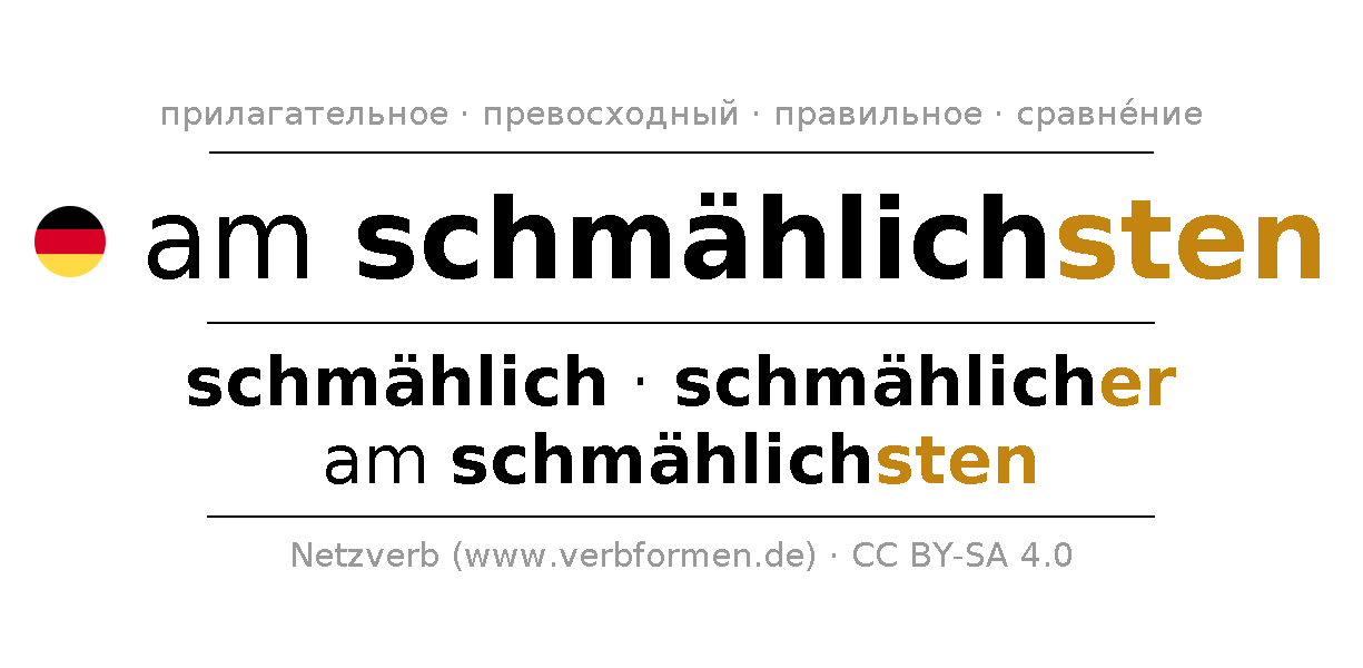 Склонение и степени сравнения am schmählichsten онлайн в виде таблиц, содержащих все формы сильного, слабого и смешанного склонений. Для наглядности они сведены в одну общую таблицу, в которой представлены формы единственного (Singular) и множественного (Plural) числа всех четырёх падежей: именительного (номинатив или 1-й падеж - кто? что?), родительного (генитив или 2-й падеж - кого? чего? чей?), дательного (датив или 3-й падеж - кому? чему?) и винительного (аккузатив или 4-й падеж - кого? что?). Более подробную информацию Вы найдёте на ... викисловаря ... и на ... в Дудене.