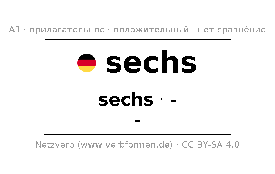 - Множественное число: die sechs, der sechs, den sechs, die sechs