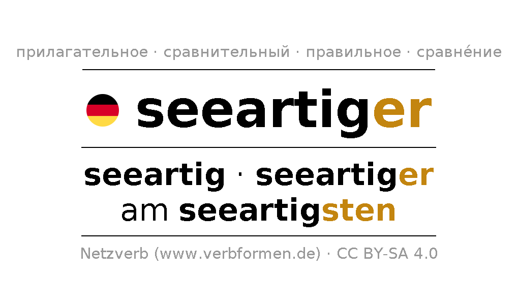 - Множественное число: die seeartigeren, der seeartigeren, den seeartigeren, die seeartigeren