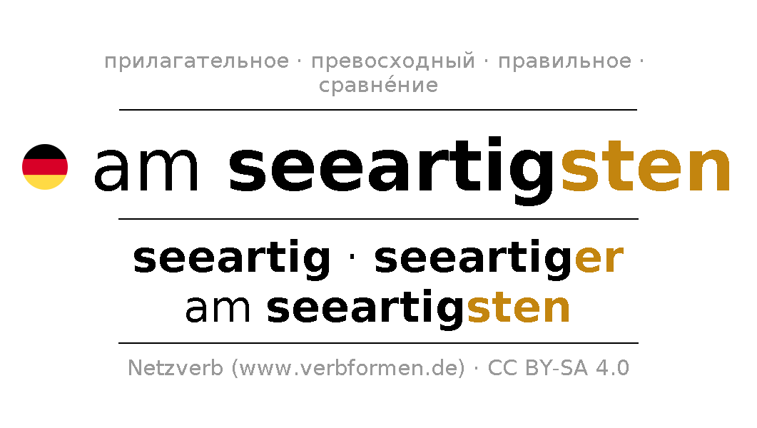 - Множественное число: die seeartigsten, der seeartigsten, den seeartigsten, die seeartigsten