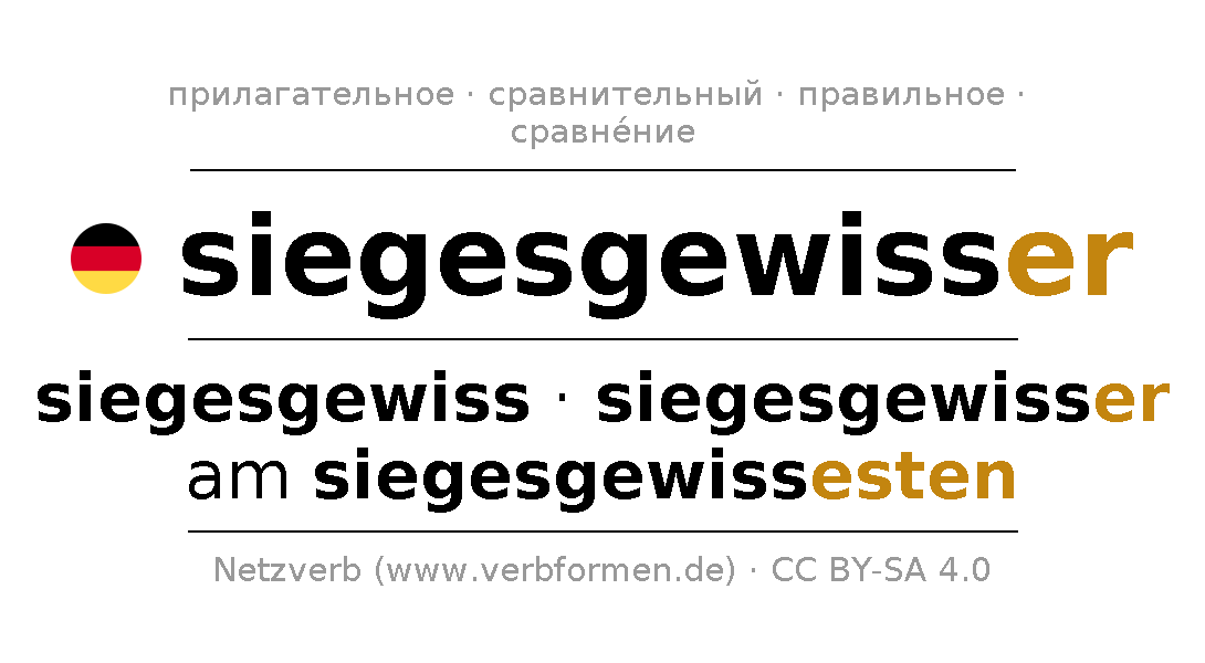 Прилагательное склоняется siegesgewisser (уверенный в победе) и в степенях сравнения siegesgewiss,siegesgewisser,am siegesgewissesten . Формы сравнительной и превосходной степеней прилагательного имеют следующие суффиксы er/esten. Прилагательное siegesgewisser может употребляться как в качестве определения перед существительным (с артиклем и без него, в формах сильного, слабого и смешанного склонений), так и в качестве именной части сказуемого в сочетании с глаголом.Можно не только отразить и сравнить siegesgewisser, но и все немецкие прилагательные. Kомментарии ☆