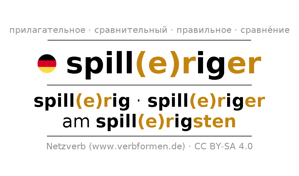 - Mужской род: ein spill(e)rigerer, eines spill(e)rigeren, einem spill(e)rigeren, einen spill(e)rigeren