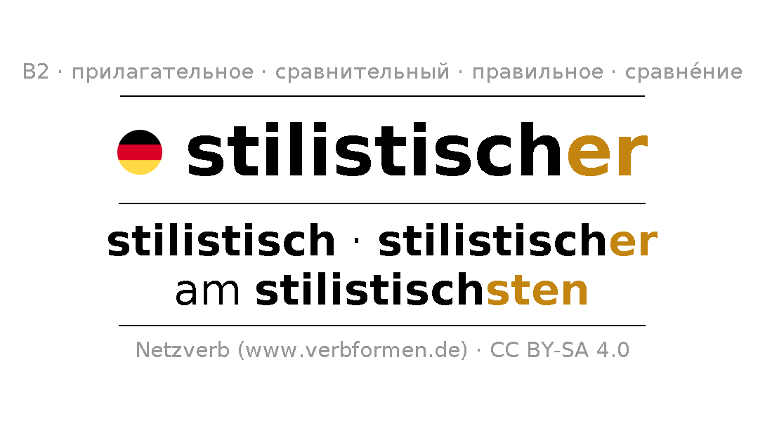 Прилагательное склоняется stilistischer (стилистический) и в степенях сравнения stilistisch,stilistischer,am stilistischsten . Формы сравнительной и превосходной степеней прилагательного имеют следующие суффиксы er/sten. Прилагательное stilistischer может употребляться как в качестве определения перед существительным (с артиклем и без него, в формах сильного, слабого и смешанного склонений), так и в качестве именной части сказуемого в сочетании с глаголом.Можно не только отразить и сравнить stilistischer, но и все немецкие прилагательные. Kомментарии ☆