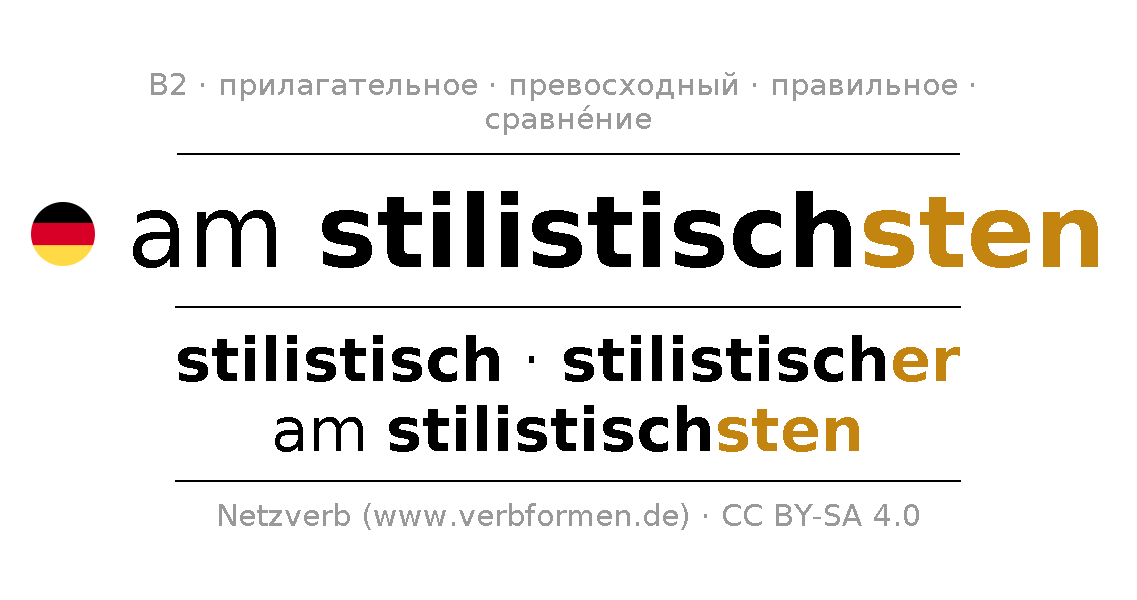 Прилагательное склоняется am stilistischsten (стилистический) и в степенях сравнения stilistisch,stilistischer,am stilistischsten . Формы сравнительной и превосходной степеней прилагательного имеют следующие суффиксы er/sten. Прилагательное am stilistischsten может употребляться как в качестве определения перед существительным (с артиклем и без него, в формах сильного, слабого и смешанного склонений), так и в качестве именной части сказуемого в сочетании с глаголом.Можно не только отразить и сравнить am stilistischsten, но и все немецкие прилагательные. Kомментарии ☆