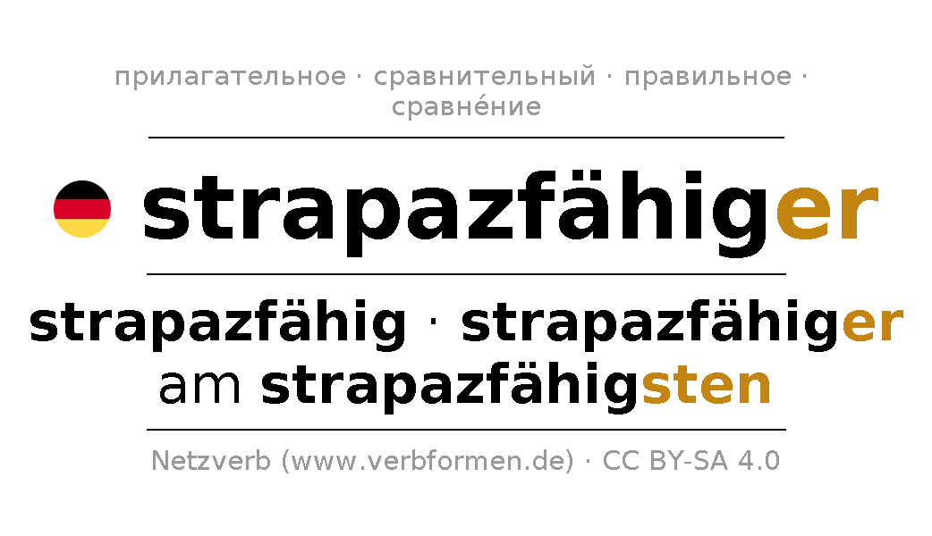 Прилагательное склоняется strapazfähiger (износостойкий, устойчивый к нагрузке) и в степенях сравнения strapazfähig,strapazfähiger,am strapazfähigsten . Формы сравнительной и превосходной степеней прилагательного имеют следующие суффиксы er/sten. Прилагательное strapazfähiger может употребляться как в качестве определения перед существительным (с артиклем и без него, в формах сильного, слабого и смешанного склонений), так и в качестве именной части сказуемого в сочетании с глаголом.Можно не только отразить и сравнить strapazfähiger, но и все немецкие прилагательные. Kомментарии ☆