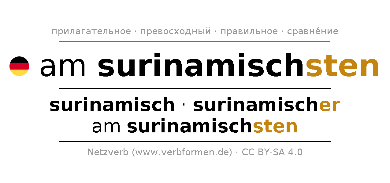 Прилагательное склоняется am surinamischsten (суринамский, суринамское) и в степенях сравнения surinamisch,surinamischer,am surinamischsten . Формы сравнительной и превосходной степеней прилагательного имеют следующие суффиксы er/sten. Прилагательное am surinamischsten может употребляться как в качестве определения перед существительным (с артиклем и без него, в формах сильного, слабого и смешанного склонений), так и в качестве именной части сказуемого в сочетании с глаголом.Можно не только отразить и сравнить am surinamischsten, но и все немецкие прилагательные. Kомментарии ☆