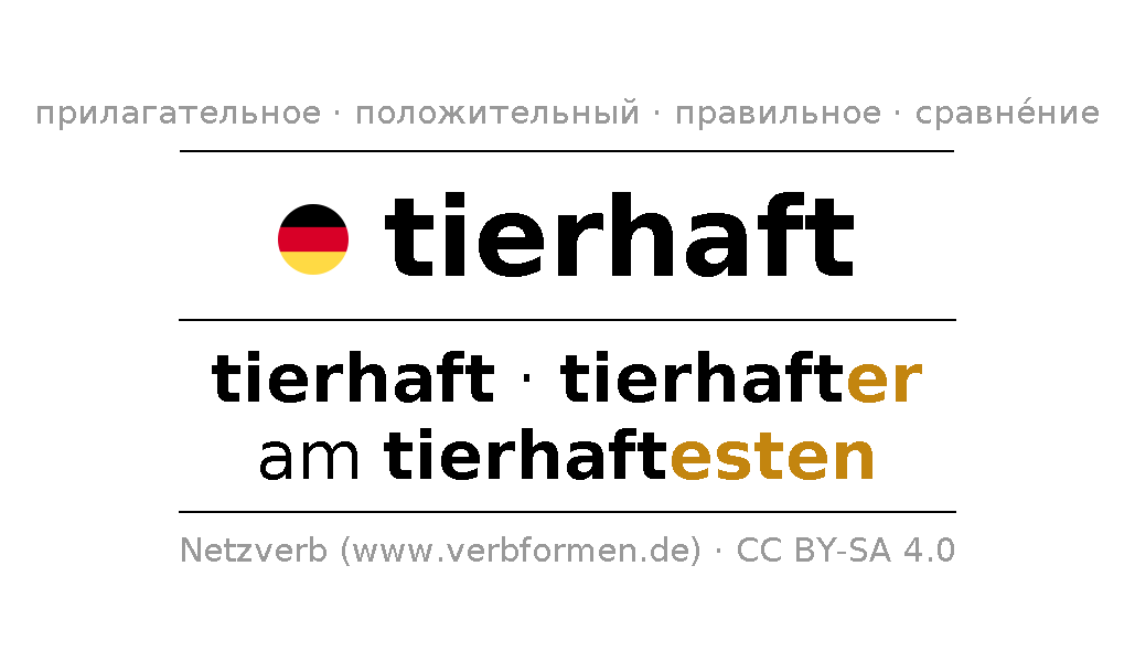Прилагательное склоняется tierhaft (животный, звериный) и в степенях сравнения tierhaft,tierhafter,am tierhaftesten . Формы сравнительной и превосходной степеней прилагательного имеют следующие суффиксы er/esten. Прилагательное tierhaft может употребляться как в качестве определения перед существительным (с артиклем и без него, в формах сильного, слабого и смешанного склонений), так и в качестве именной части сказуемого в сочетании с глаголом.Можно не только отразить и сравнить tierhaft, но и все немецкие прилагательные. Kомментарии ☆