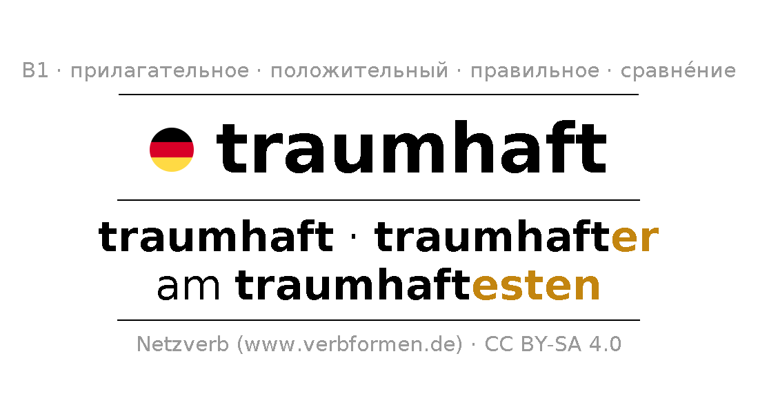 Склонение и степени сравнения traumhaft онлайн в виде таблиц, содержащих все формы сильного, слабого и смешанного склонений. Для наглядности они сведены в одну общую таблицу, в которой представлены формы единственного (Singular) и множественного (Plural) числа всех четырёх падежей: именительного (номинатив или 1-й падеж - кто? что?), родительного (генитив или 2-й падеж - кого? чего? чей?), дательного (датив или 3-й падеж - кому? чему?) и винительного (аккузатив или 4-й падеж - кого? что?). Более подробную информацию Вы найдёте на ... викисловаря ... и на ... в Дудене.