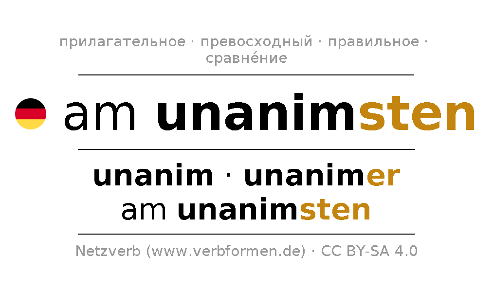 Прилагательное склоняется am unanimsten (единогласный, единодушный) и в степенях сравнения unanim,unanimer,am unanimsten . Формы сравнительной и превосходной степеней прилагательного имеют следующие суффиксы er/sten. Прилагательное am unanimsten может употребляться как в качестве определения перед существительным (с артиклем и без него, в формах сильного, слабого и смешанного склонений), так и в качестве именной части сказуемого в сочетании с глаголом.Можно не только отразить и сравнить am unanimsten, но и все немецкие прилагательные. Kомментарии ☆