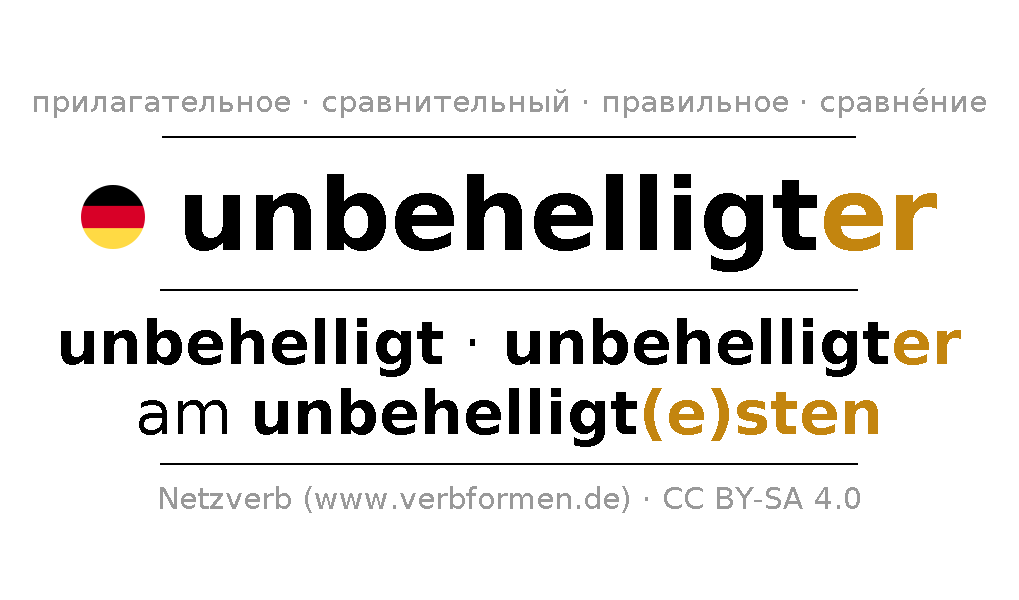 Склонение и степени сравнения unbehelligter онлайн в виде таблиц, содержащих все формы сильного, слабого и смешанного склонений. Для наглядности они сведены в одну общую таблицу, в которой представлены формы единственного (Singular) и множественного (Plural) числа всех четырёх падежей: именительного (номинатив или 1-й падеж - кто? что?), родительного (генитив или 2-й падеж - кого? чего? чей?), дательного (датив или 3-й падеж - кому? чему?) и винительного (аккузатив или 4-й падеж - кого? что?). Более подробную информацию Вы найдёте на ... викисловаря ... и на ... в Дудене.
