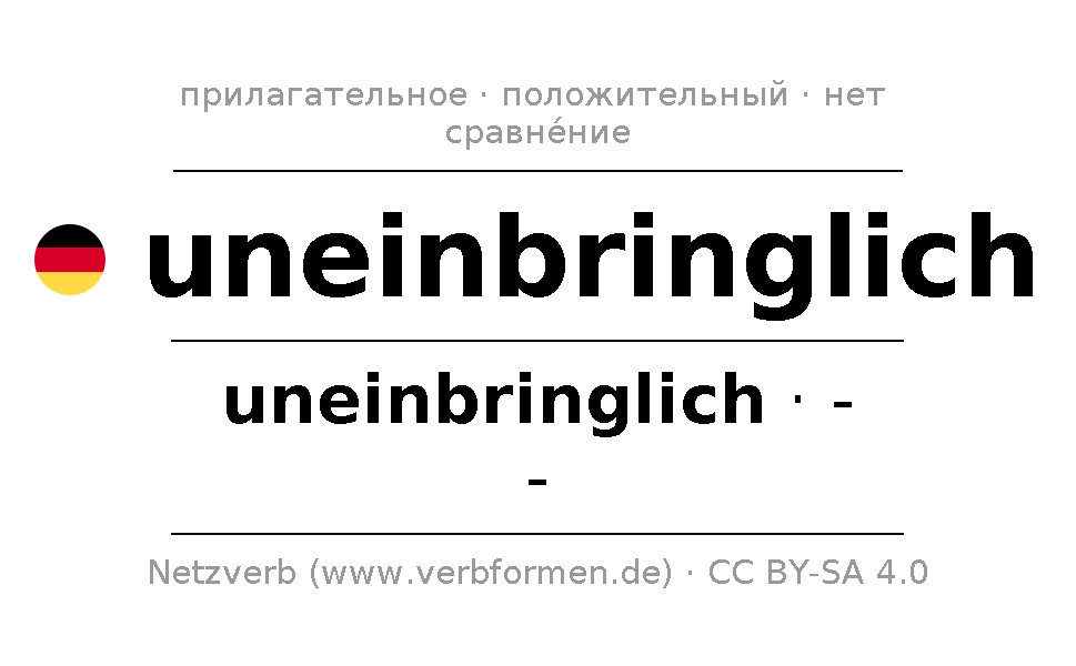 Склонение и степени сравнения uneinbringlich онлайн в виде таблиц, содержащих все формы сильного, слабого и смешанного склонений. Для наглядности они сведены в одну общую таблицу, в которой представлены формы единственного (Singular) и множественного (Plural) числа всех четырёх падежей: именительного (номинатив или 1-й падеж - кто? что?), родительного (генитив или 2-й падеж - кого? чего? чей?), дательного (датив или 3-й падеж - кому? чему?) и винительного (аккузатив или 4-й падеж - кого? что?). Более подробную информацию Вы найдёте на ... викисловаря ... и на ... в Дудене.