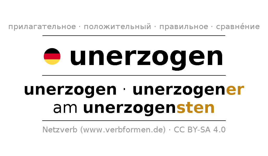 Прилагательное склоняется unerzogen (без манер, невоспитанный) и в степенях сравнения unerzogen,unerzogener,am unerzogensten . Формы сравнительной и превосходной степеней прилагательного имеют следующие суффиксы er/sten. Прилагательное unerzogen может употребляться как в качестве определения перед существительным (с артиклем и без него, в формах сильного, слабого и смешанного склонений), так и в качестве именной части сказуемого в сочетании с глаголом.Можно не только отразить и сравнить unerzogen, но и все немецкие прилагательные. Kомментарии ☆