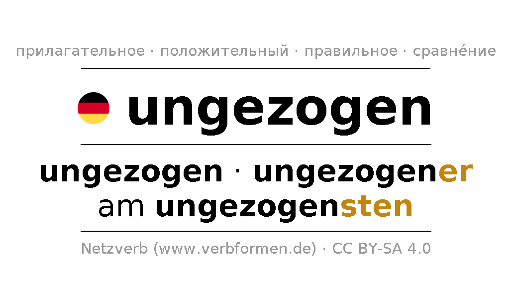Прилагательное склоняется ungezogen (непослушный, непокорный) и в степенях сравнения ungezogen,ungezogener,am ungezogensten . Формы сравнительной и превосходной степеней прилагательного имеют следующие суффиксы er/sten. Прилагательное ungezogen может употребляться как в качестве определения перед существительным (с артиклем и без него, в формах сильного, слабого и смешанного склонений), так и в качестве именной части сказуемого в сочетании с глаголом.Можно не только отразить и сравнить ungezogen, но и все немецкие прилагательные. Kомментарии ☆