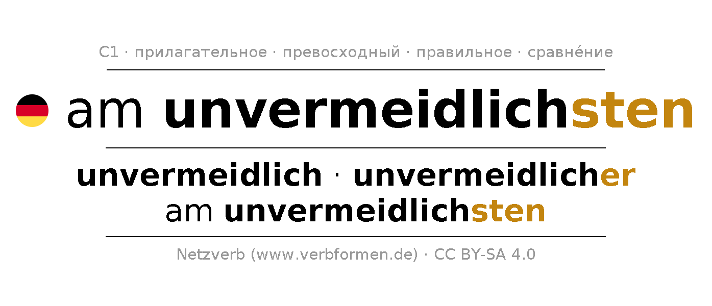 Прилагательное склоняется am unvermeidlichsten (неизбежный, неминуемый) и в степенях сравнения unvermeidlich,unvermeidlicher,am unvermeidlichsten . Формы сравнительной и превосходной степеней прилагательного имеют следующие суффиксы er/sten. Прилагательное am unvermeidlichsten может употребляться как в качестве определения перед существительным (с артиклем и без него, в формах сильного, слабого и смешанного склонений), так и в качестве именной части сказуемого в сочетании с глаголом.Можно не только отразить и сравнить am unvermeidlichsten, но и все немецкие прилагательные. Kомментарии ☆